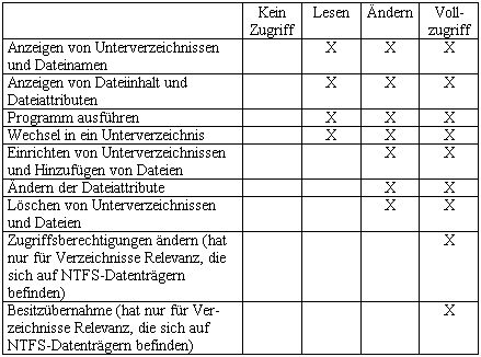 Unter Windows NT gibt es folgende Freigabeberechtigungen: "Kein Zugriff", "Lesen", "Ändern" und "Vollzugriff". Die Aktionen, die die einzelnen Freigabeberechtigungen ermöglichen, ergeben sich aus folgender Tabelle: